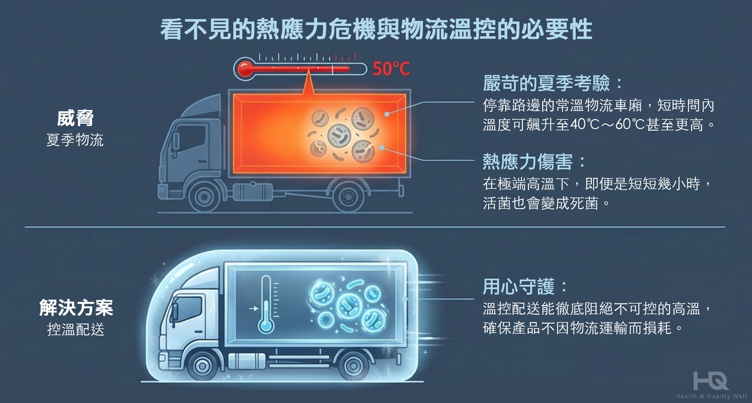 雖然產品在研發階段已通過常溫安定性測試,足以應對日常生活環境,但台灣夏季的物流環境卻是嚴苛的考驗。停靠在路側的物流車廂,內部溫度常在短時間內飆升至45°C甚至50°C。在這種極端的「熱應力」下,即便只有短短幾小時,活菌也可能因高溫受到傷害,提前進入失活狀態。