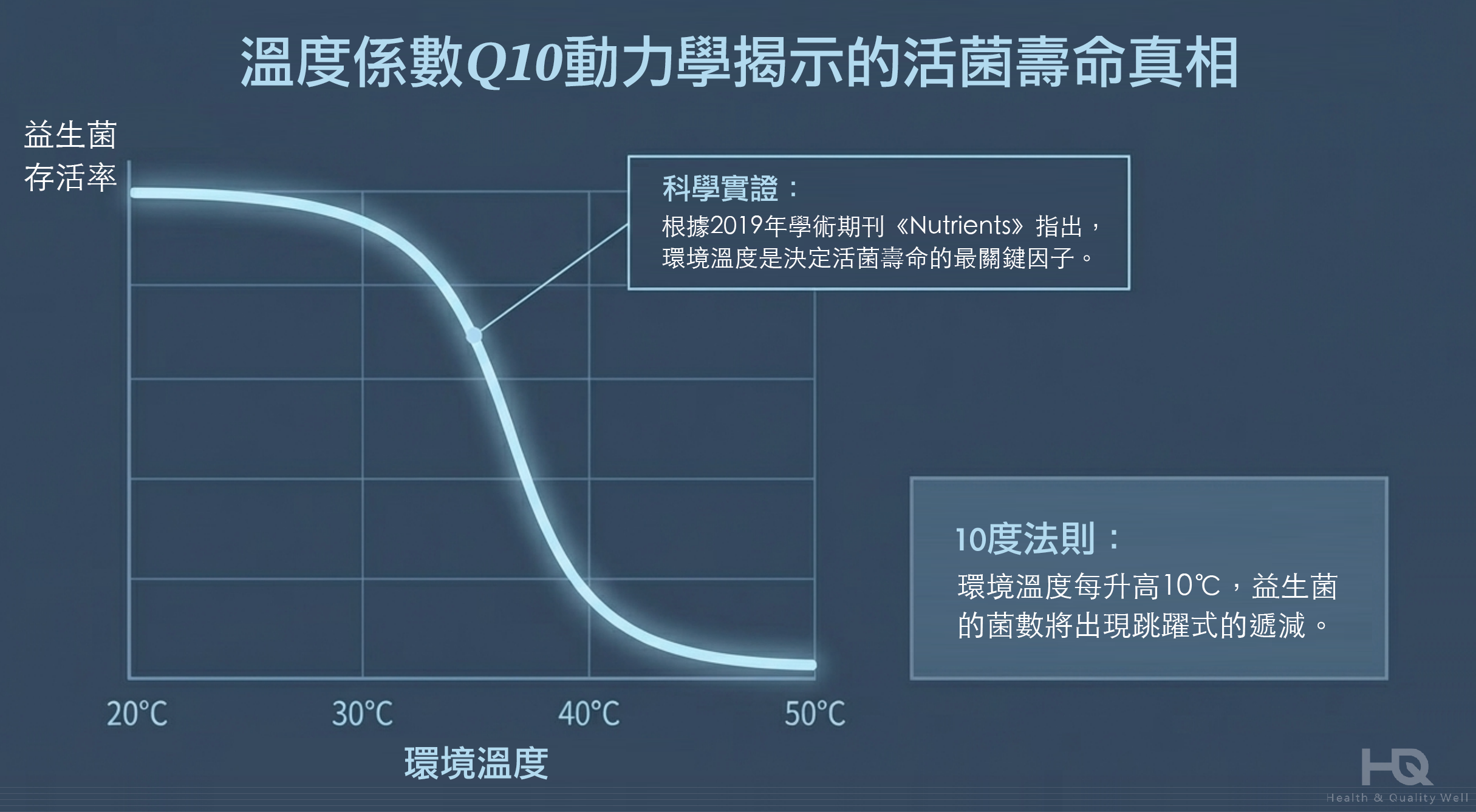 根據2019年發表於學術期刊《Nutrients》的文獻《食品系統中的益生菌:提高活性與強化傳遞策略》指出,溫度是決定活菌壽命的最關鍵變數。在微生物生理學的實驗中觀察到,環境溫度每升高10°C,其失活反應速率將會隨之倍增,導致活菌數出現跳躍式的遞減。