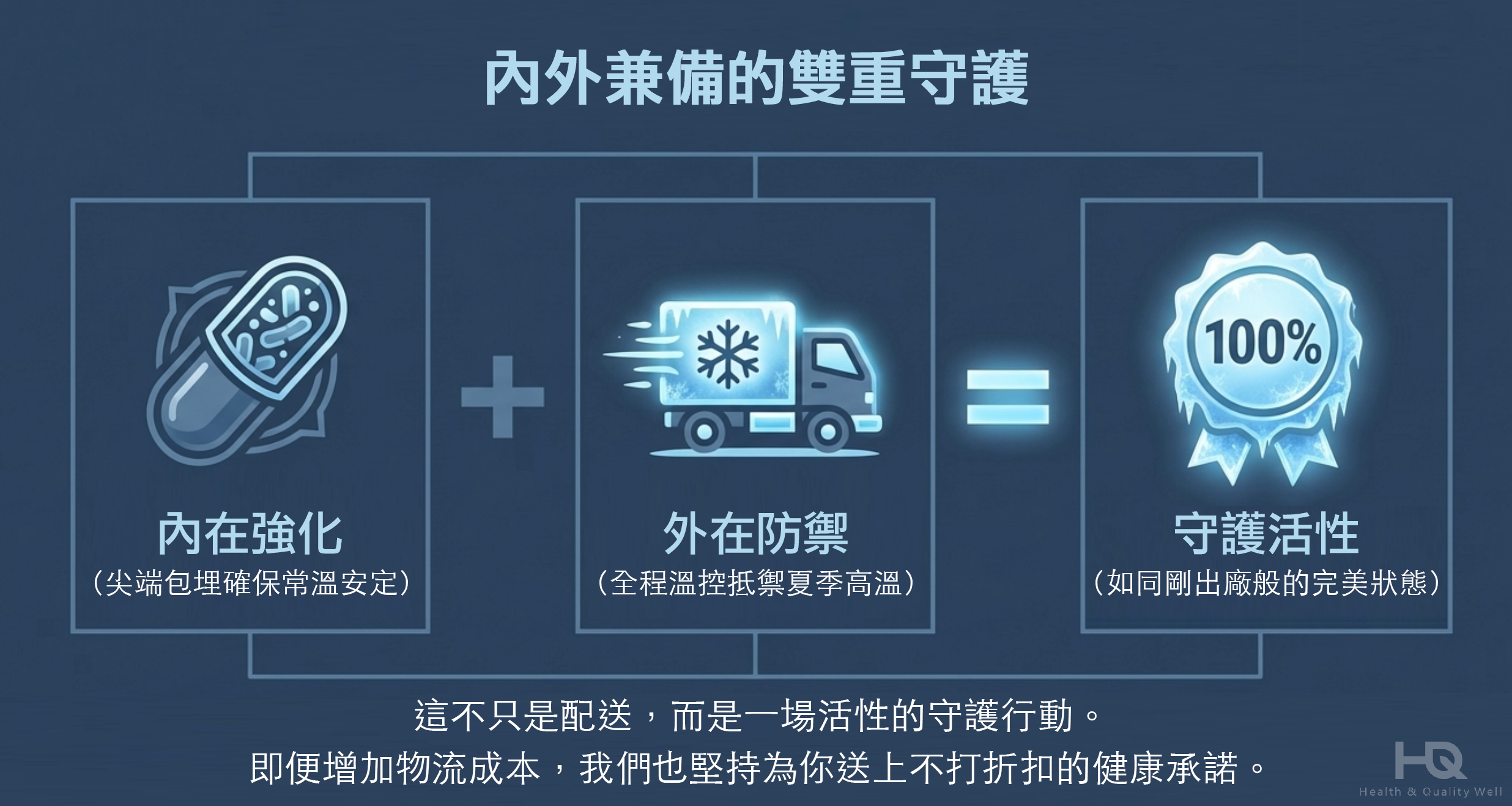 透過冷鏈配送,我們主動阻絕物流運輸中不可控的「異常高溫」,確保產品在到達你家門前,始終處於最精準的保護區。